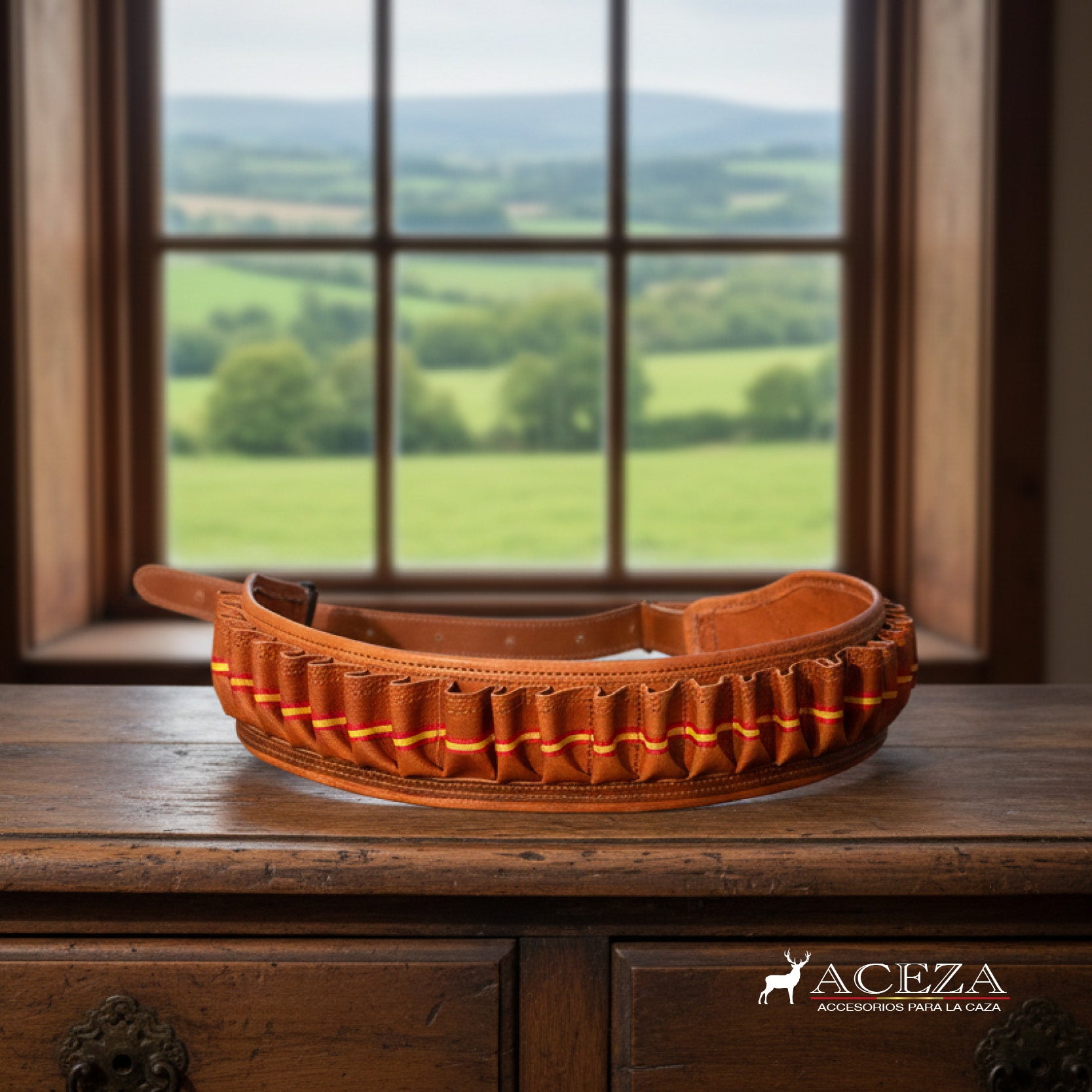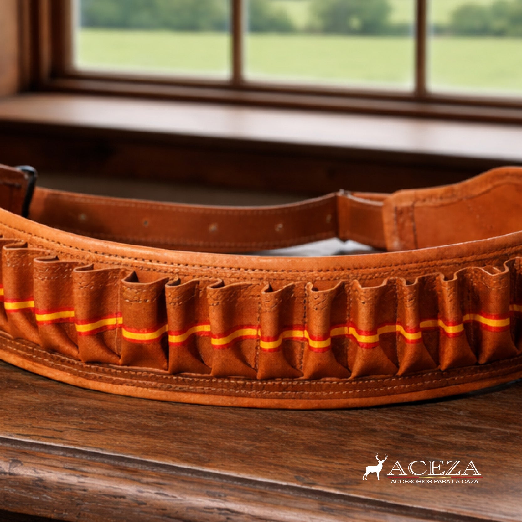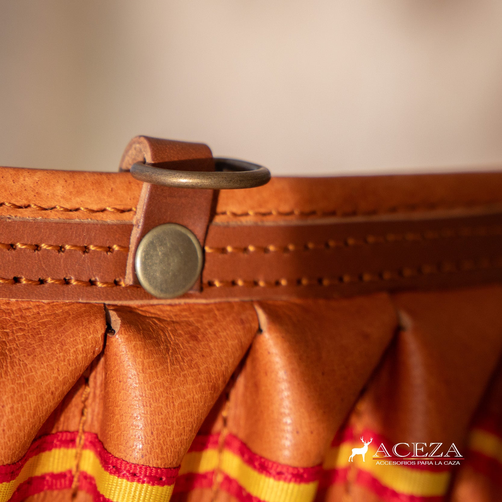 Como detalle distintivo, incorpora una discreta banda con los colores de la bandera de España, integrada de forma sobria en los portacartuchos, como guiño a la tradición y al origen de la pieza, sin romper la estética clásica de la canana.